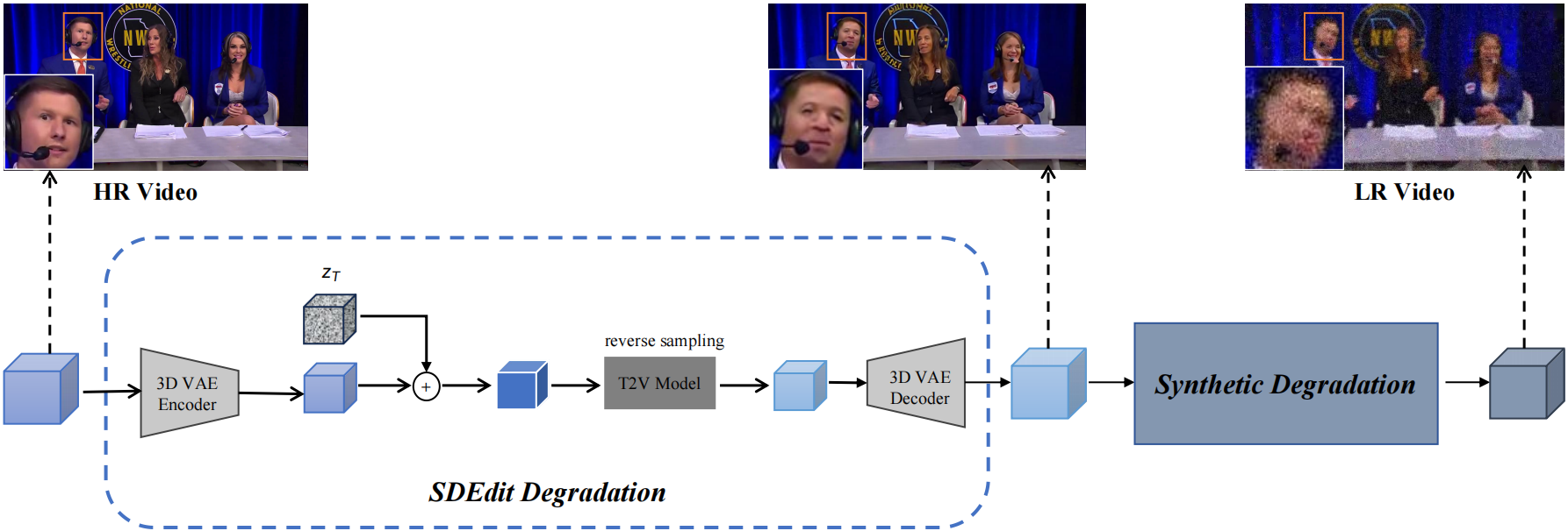 We first perform sdedit degradation to modify the local structure of HR video using the sdedit method by our text-to-video base model. Afterwards, we apply traditional synthetic degradation to introduce high-frequency degradation pattern.