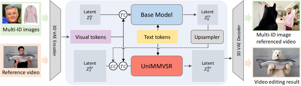 Overview of UniMMVSR in the context of a cascaded generation framework. Upsampler denotes the sequential operations of VAE decoding, upscaling via bilinear interpolation, and VAE encoding. TC and CC denote token concatenation and channel concatenation respectively. Texts are encoded by text encoder and then injected via cross-attention layers.